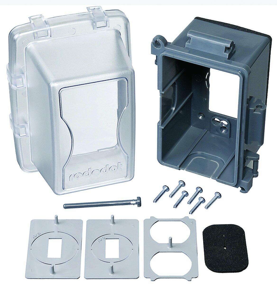 The Thomas & Betts 1‑Gang Deep Clear Cover (Code Keeper® Weatherproof While‑in‑Use Cover) is an extra‑duty enclosure built to protect electrical receptacles (single, duplex, GFCI, or switches) in harsh or wet environments. It accepts GFCI, duplex, switch and up to 1-3/8" round devices. Nonconductive, noncorrosive, and impact resistant. Won't rust or fade. Scratch resistant. For use in wet/damp locations. Keyhole mounts, loosen the existing device screws and slide the cover over. Comes with adapter plates and pre-adhered gaskets. Wasp guard included to keep out unwanted pests. Lockable for security. UL Listed.