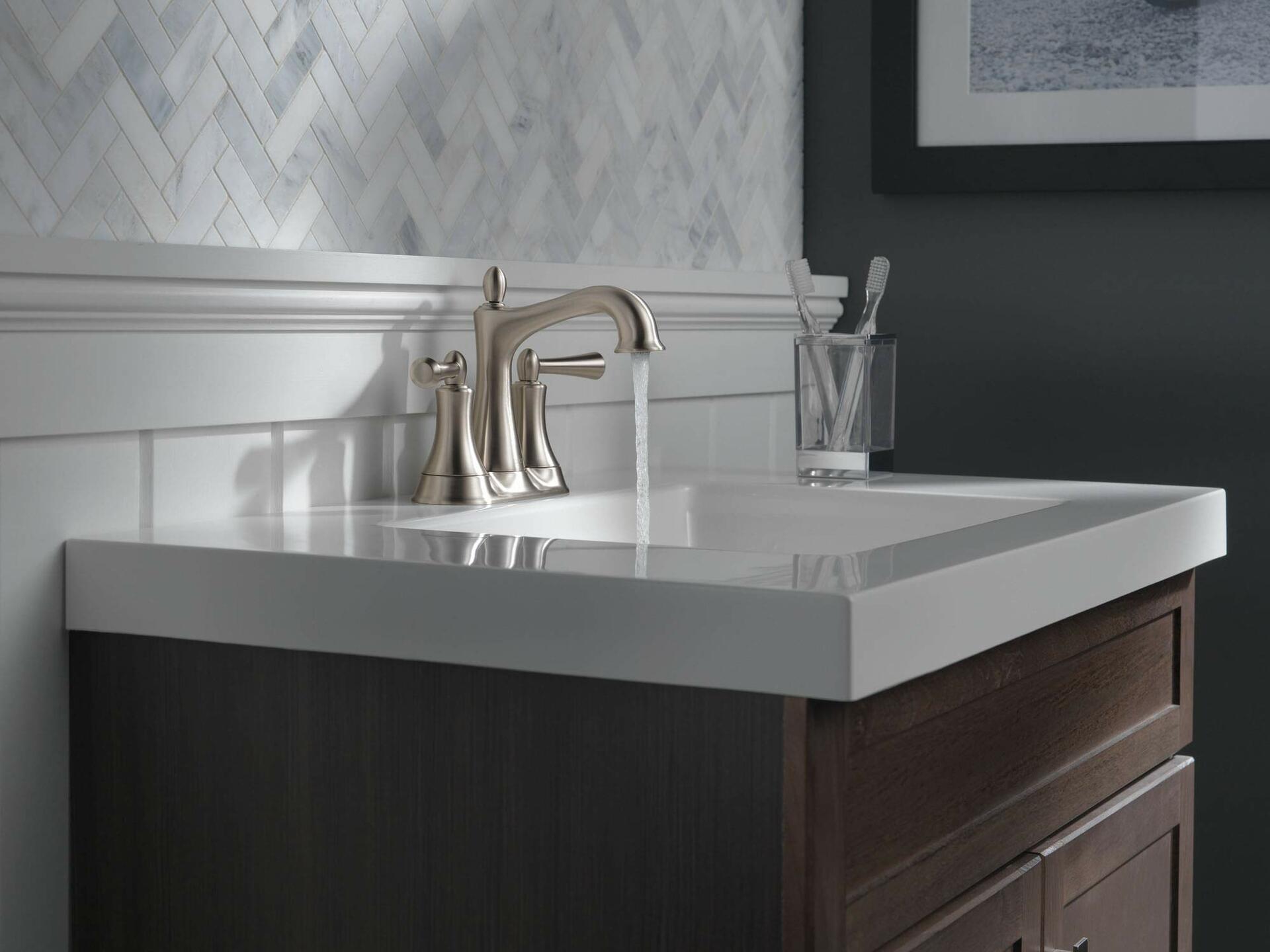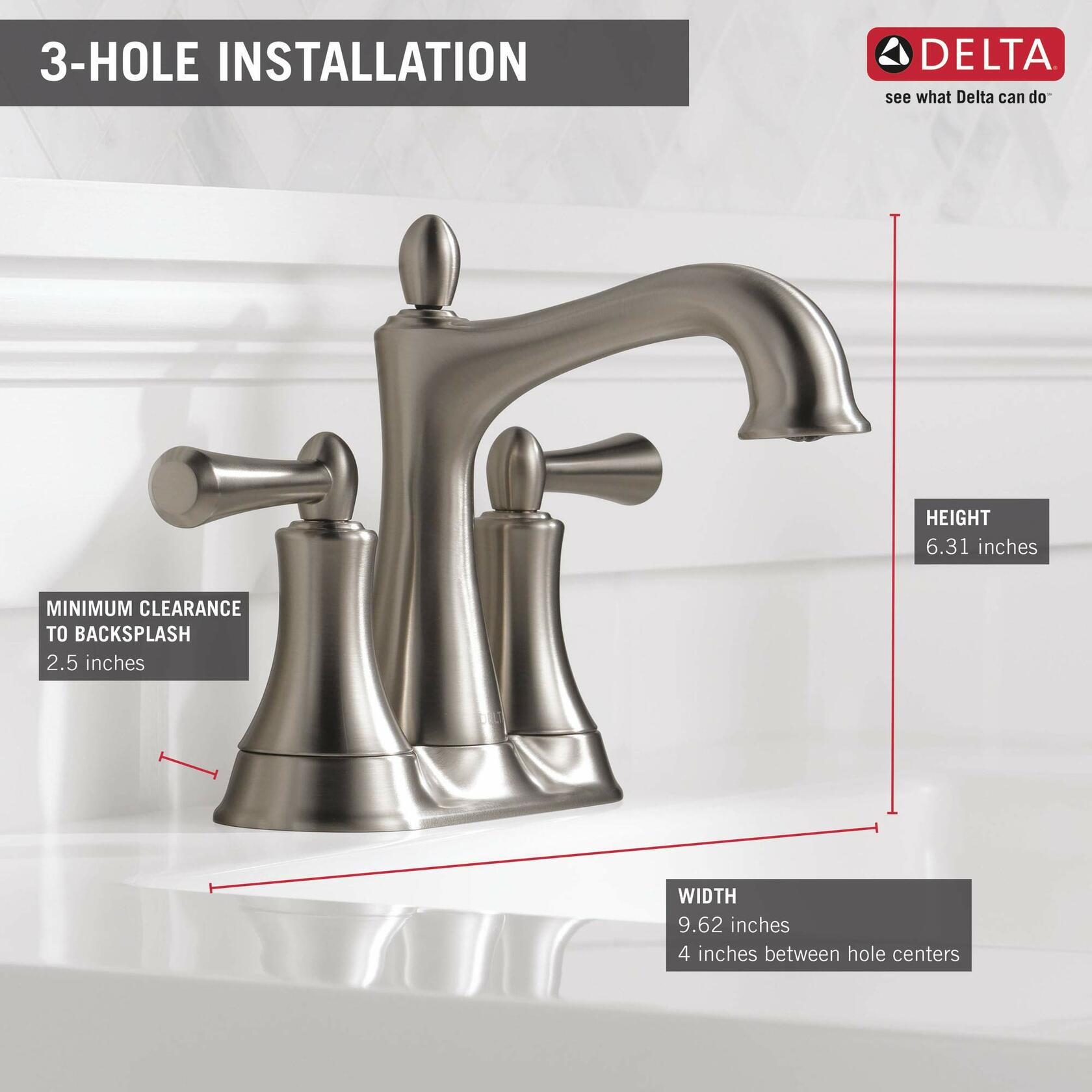 The Delta Rila 25774LF‑SP is a refined 4″ centerset bathroom faucet featuring dual lever handles and a high‑arc spout, finished in elegant SpotShield® brushed nickel to resist water spots and fingerprints. Crafted with a durable brass body, it operates with a washerless cartridge for smooth, maintenance‑free performance and meets ADA as well as low‑lead compliance standards. With a 1.2 GPM flow rate, it’s WaterSense®-labeled for water efficiency and includes a matching pop‑up drain with a “Worry‑Free Drain Catch” to prevent valuables from washing away. Delta backs the Rila series with its limited lifetime warranty.