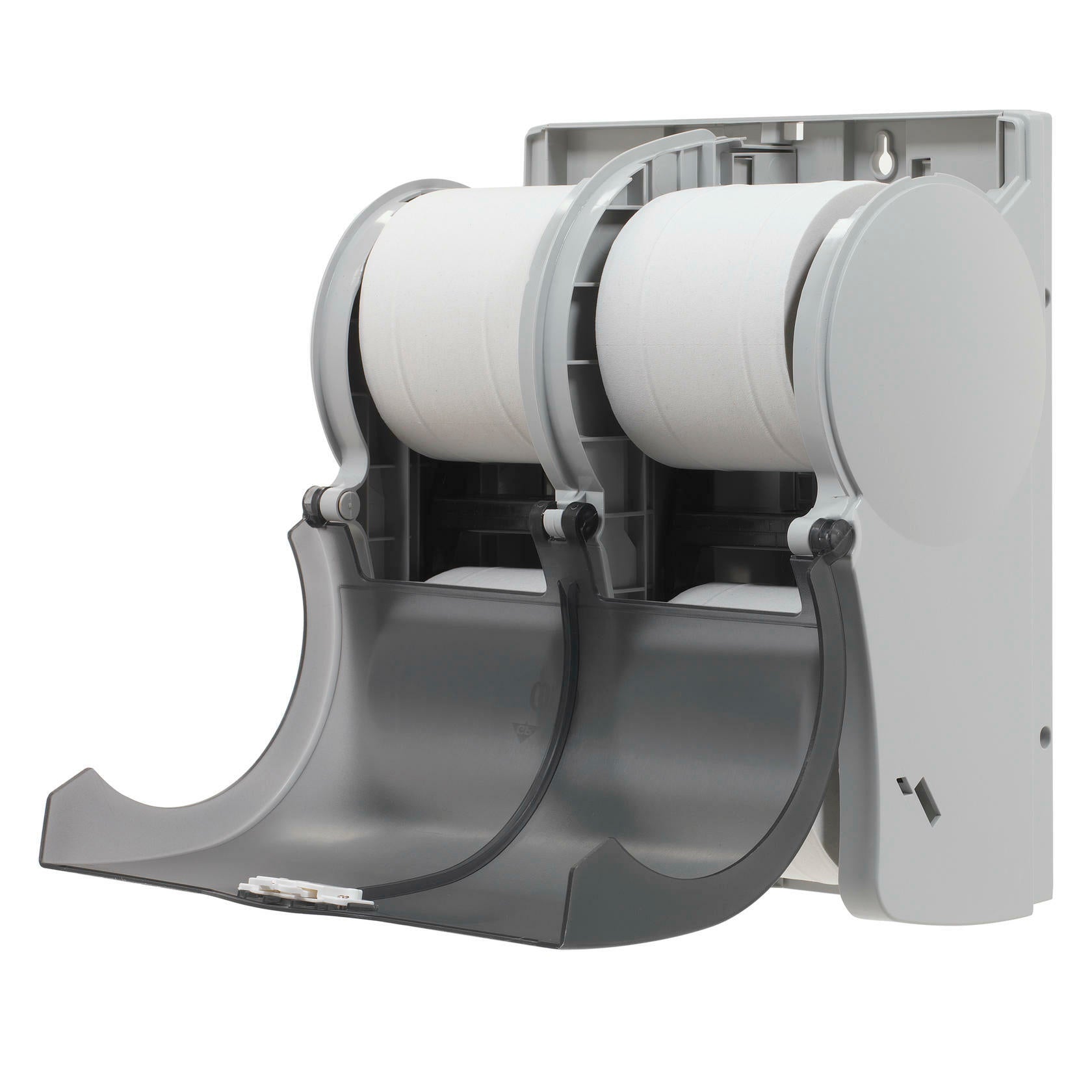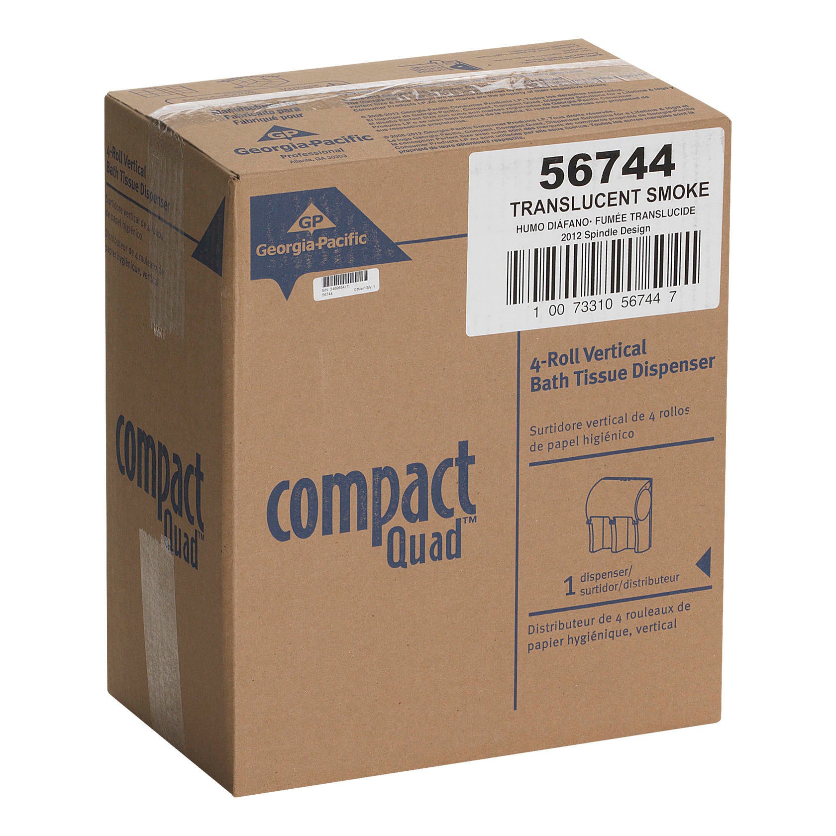 The GP Pro Georgia-Pacific 56744 Compact Quad® 4-Roll Toilet Paper Dispenser in Smoke is a high-capacity, coreless system designed for busy restrooms, holding up to 6,000 2-ply or 12,000 1-ply sheets. Its vertical roll design and dependable roll-advancing system minimize tabbing, ensure continuous service, and enhance user satisfaction. Easy to install and maintain, this durable dispenser comes with a 10-year warranty, making it a reliable choice for any commercial facility.