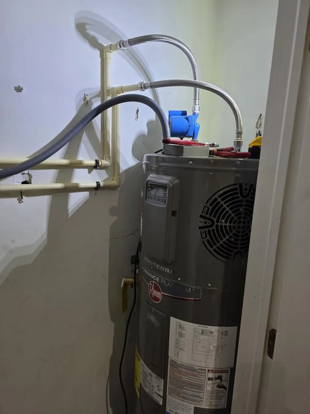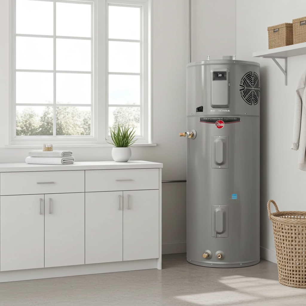 The Rheem ProTerra 50 Gallon Smart Hybrid Heat Pump Water Heater is designed for maximum efficiency and intelligent performance. Utilizing advanced heat pump technology, it delivers up to 4X greater efficiency compared to standard electric water heaters, helping reduce energy costs significantly. With built-in Wi-Fi and EcoNet connectivity, users can monitor, control, and optimize hot water usage from anywhere. This ENERGY STAR® certified unit is eligible for rebates and tax credits, making it a cost-effective and eco-friendly solution for modern homes. Backed by a 10-year limited warranty, it offers long-term reliability and performance.